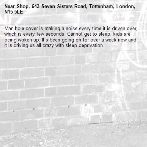 Man hole cover is making a noise every time it is driven over, which is every few seconds. Cannot get to sleep, kids are being woken up. It’s been going on for over a week now and it is driving us all crazy with sleep deprivation