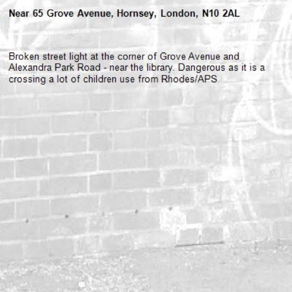Broken street light at the corner of Grove Avenue and Alexandra Park Road - near the library. Dangerous as it is a crossing a lot of children use from Rhodes/APS
