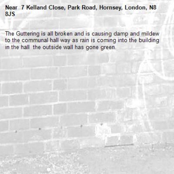 The Guttering is all broken and is causing damp and mildew to the communal hall way as rain is coming into the building in the hall the outside wall has gone green.