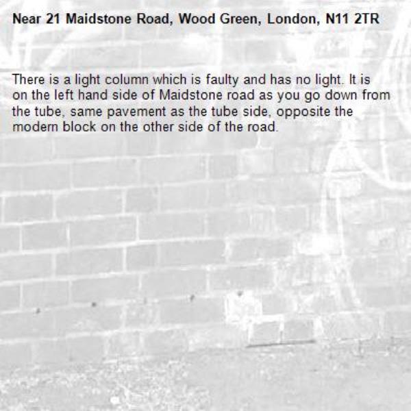 There is a light column which is faulty and has no light. It is on the left hand side of Maidstone road as you go down from the tube, same pavement as the tube side, opposite the modern block on the other side of the road.