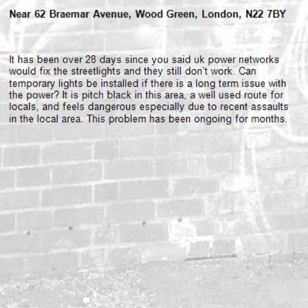 It has been over 28 days since you said uk power networks would fix the streetlights and they still don’t work. Can temporary lights be installed if there is a long term issue with the power? It is pitch black in this area, a well used route for locals, and feels dangerous especially due to recent assaults in the local area. This problem has been ongoing for months.