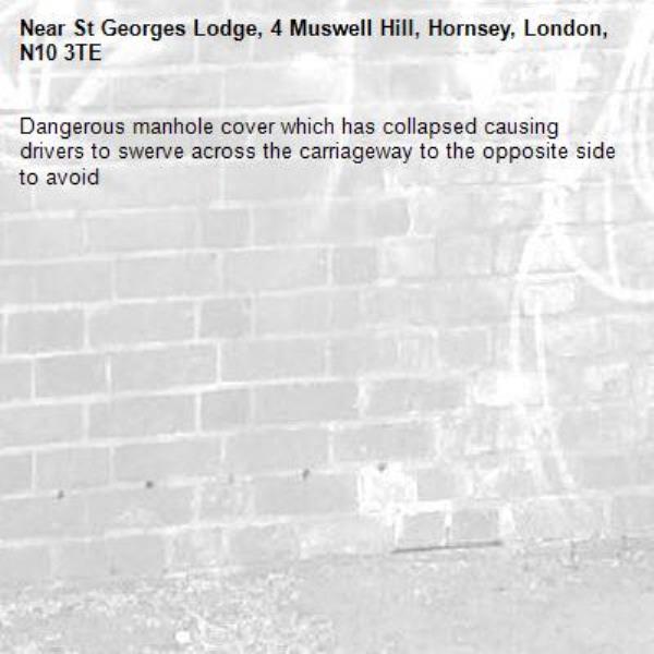 Dangerous manhole cover which has collapsed causing drivers to swerve across the carriageway to the opposite side to avoid