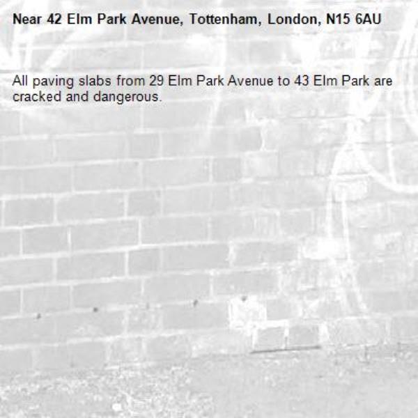 All paving slabs from 29 Elm Park Avenue to 43 Elm Park are cracked and dangerous.