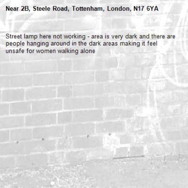 Street lamp here not working - area is very dark and there are people hanging around in the dark areas making it feel unsafe for women walking alone