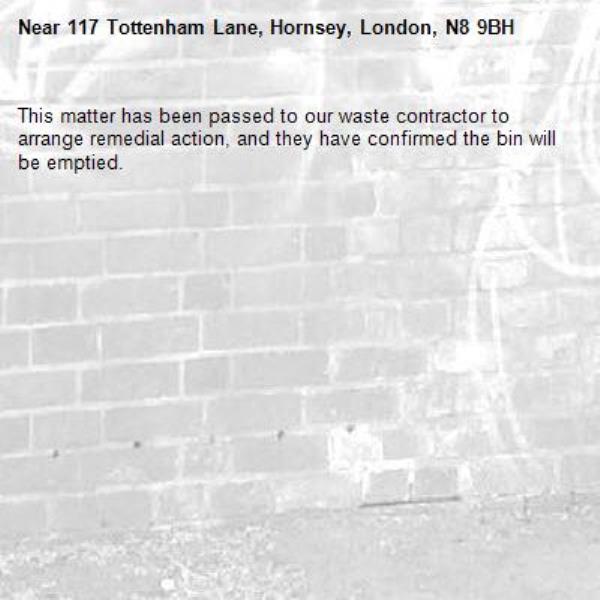 book recycling bin is full up and needs emptying as u cant fit anymore books in there . there might be a cardboard box of books dumped next to it. this book recycling bin is on the pavement of tottenham lane by the railings by hedges on the opposite side of the road to the two houses at 117 to 119 tottenham lane n8 9BH. this is on the opposite side of the road to these houses not on same side of road as these houses . seen at 2230 hours tonight. this bin has the words "veolia" written on side.