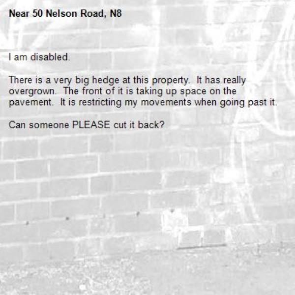 I am disabled.<br/><br/>There is a very big hedge at this property. It has really overgrown. The front of it is taking up space on the pavement. It is restricting my movements when going past it.<br/><br/>Can someone PLEASE cut it back?<br/>