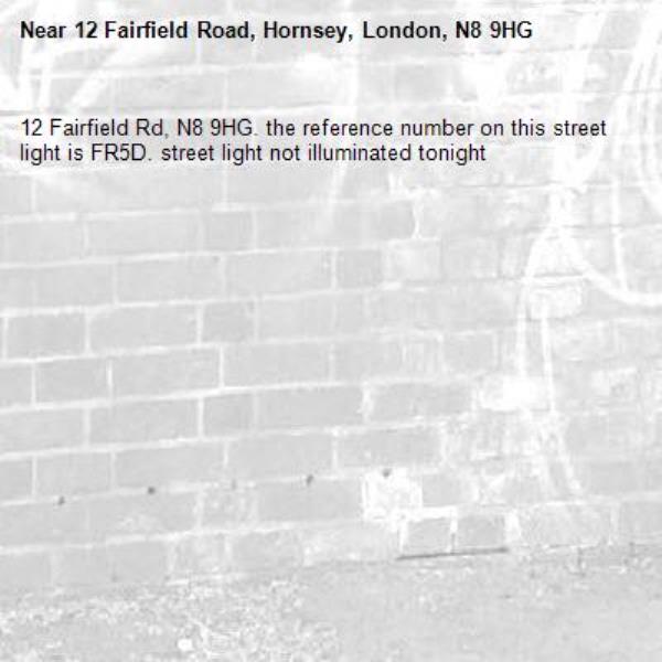 12 Fairfield Rd, N8 9HG. the reference number on this street light is FR5D. street light not illuminated tonight