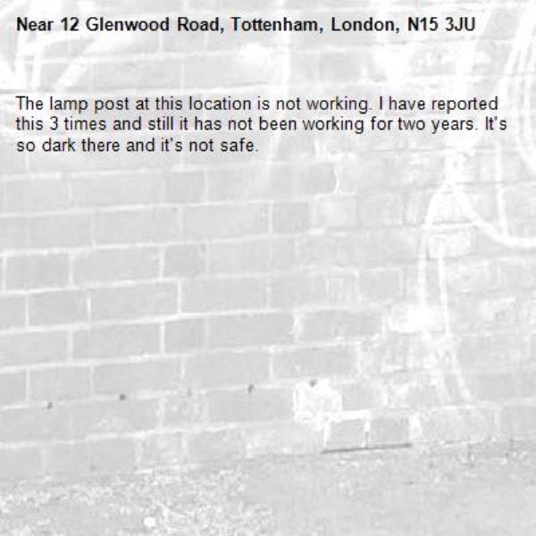 The lamp post at this location is not working. I have reported this 3 times and still it has not been working for two years. It's so dark there and it's not safe.
