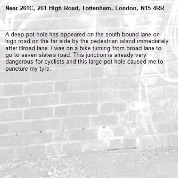 A deep pot hole has appeared on the south bound lane on high road on the far side by the pedestrian island immediately after Broad lane. I was on a bike turning from broad lane to go to seven sisters road. This junction is already very dangerous for cyclists and this large pot hole caused me to puncture my tyre.