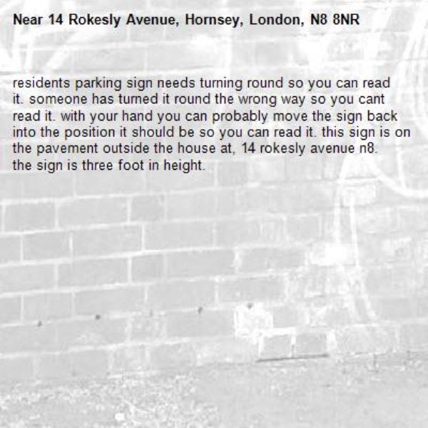 residents parking sign needs turning round so you can read it. someone has turned it round the wrong way so you cant read it. with your hand you can probably move the sign back into the position it should be so you can read it. this sign is on the pavement outside the house at, 14 rokesly avenue n8. the sign is three foot in height.
