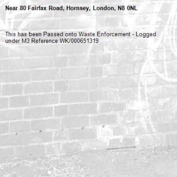 This has been Passed onto Waste Enforcement - Logged under M3 Reference WK/000651319-80 Fairfax Road, Hornsey, London, N8 0NL 15/04/2026 10:02 This has been Passed onto Waste Enforcement - Logged under M3 Reference WK/000651319