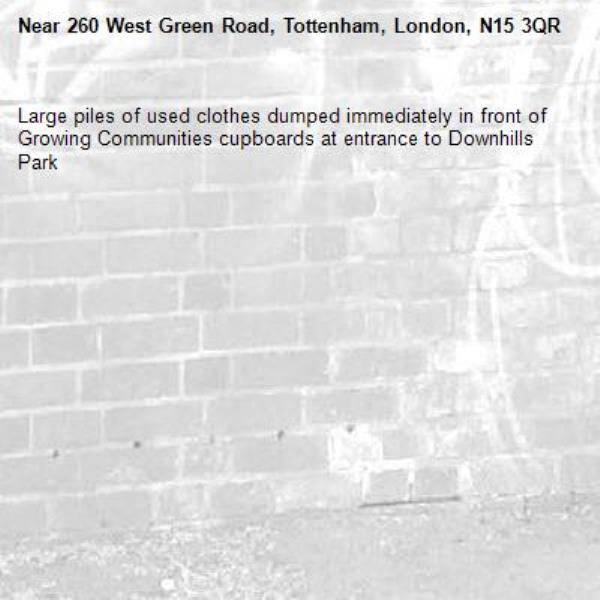 Large piles of used clothes dumped immediately in front of Growing Communities cupboards at entrance to Downhills Park