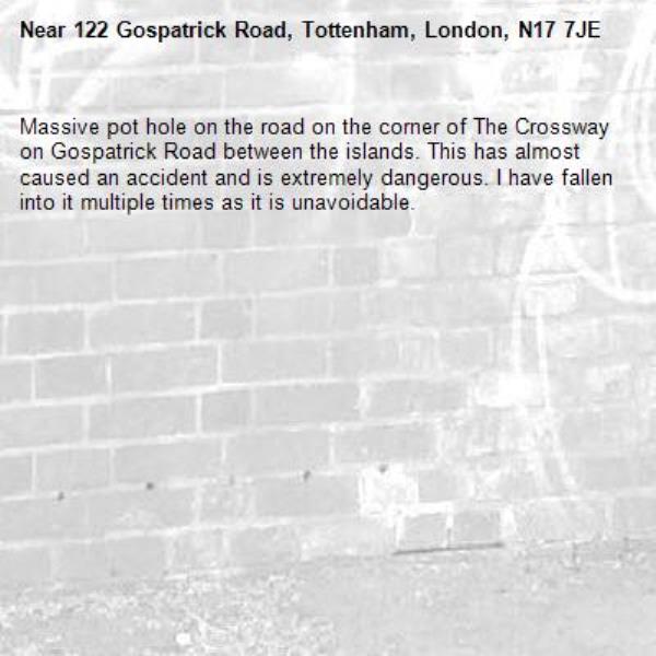 Massive pot hole on the road on the corner of The Crossway on Gospatrick Road between the islands. This has almost caused an accident and is extremely dangerous. I have fallen into it multiple times as it is unavoidable.