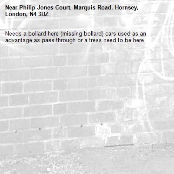 Needs a bollard here (missing bollard) cars used as an advantage as pass through or a tress need to be here