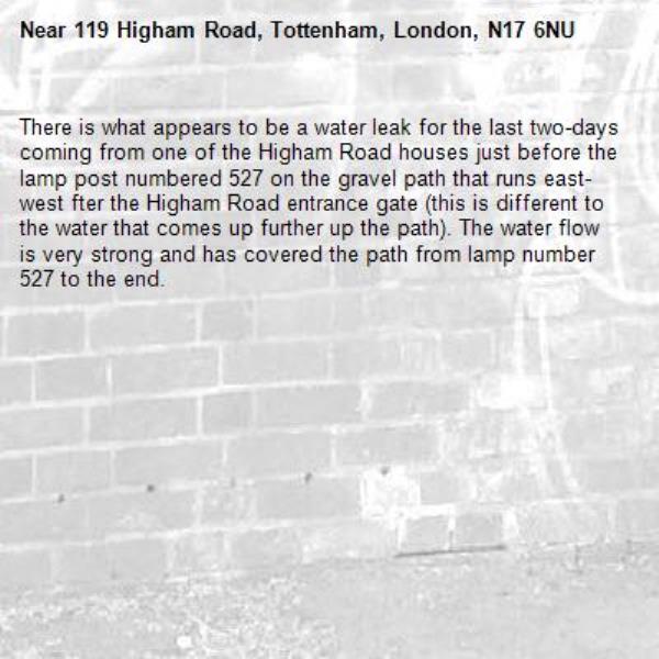 There is what appears to be a water leak for the last two-days coming from one of the Higham Road houses just before the lamp post numbered 527 on the gravel path that runs east-west fter the Higham Road entrance gate (this is different to the water that comes up further up the path). The water flow is very strong and has covered the path from lamp number 527 to the end.