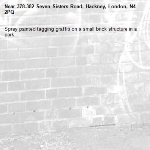 Spray painted tagging graffiti on a small brick structure in a park.