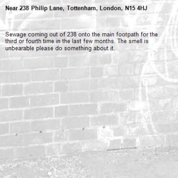 Sewage coming out of 238 onto the main footpath for the third or fourth time in the last few months. The smell is unbearable please do something about it.