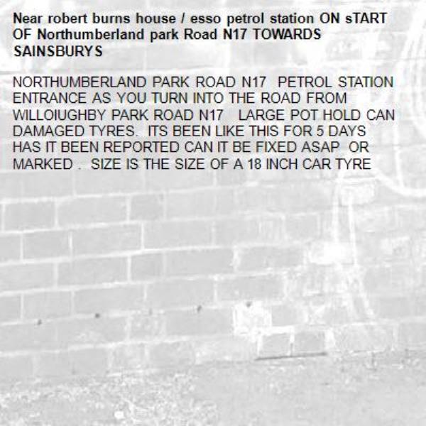 NORTHUMBERLAND PARK ROAD N17 PETROL STATION ENTRANCE AS YOU TURN INTO THE ROAD FROM WILLOIUGHBY PARK ROAD N17 LARGE POT HOLD CAN DAMAGED TYRES. ITS BEEN LIKE THIS FOR 5 DAYS HAS IT BEEN REPORTED CAN IT BE FIXED ASAP OR MARKED . SIZE IS THE SIZE OF A 18 INCH CAR TYRE