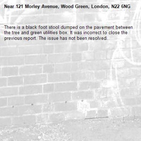 There is a black foot stool dumped on the pavement between the tree and green utilities box. It was incorrect to close the previous report. The issue has not been resolved.