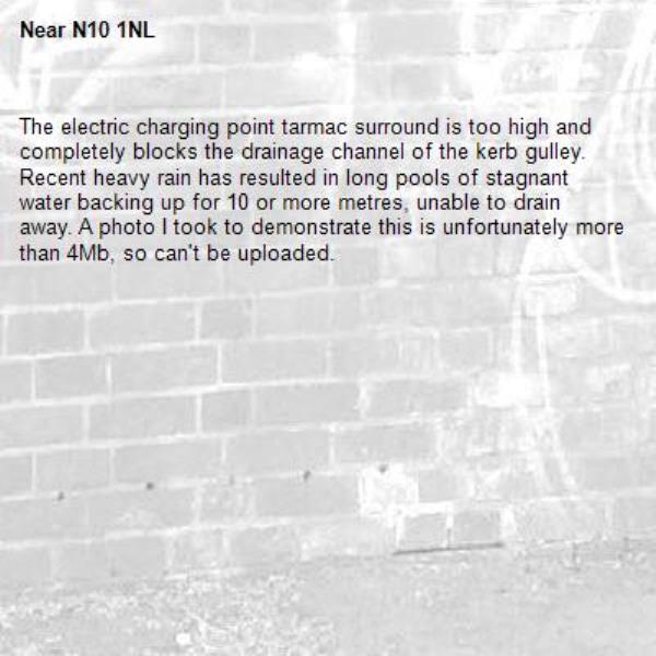 The electric charging point tarmac surround is too high and completely blocks the drainage channel of the kerb gulley. Recent heavy rain has resulted in long pools of stagnant water backing up for 10 or more metres, unable to drain away. A photo I took to demonstrate this is unfortunately more than 4Mb, so can't be uploaded.
