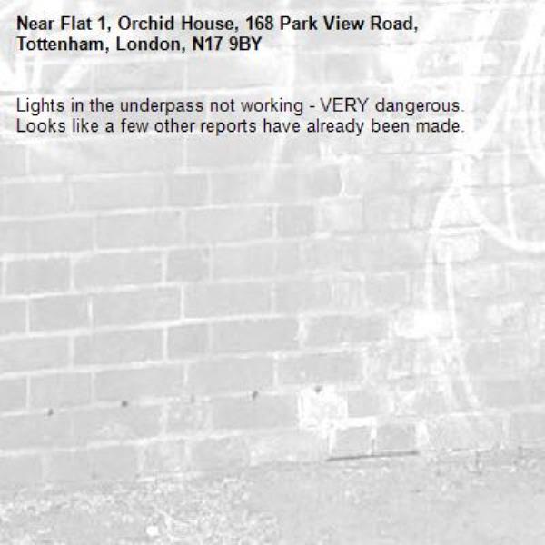 Lights in the underpass not working - VERY dangerous. Looks like a few other reports have already been made.