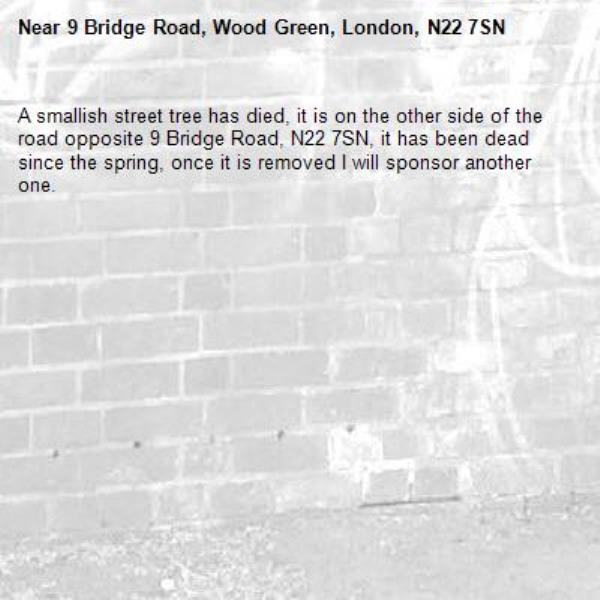 A smallish street tree has died, it is on the other side of the road opposite 9 Bridge Road, N22 7SN, it has been dead since the spring, once it is removed I will sponsor another one.