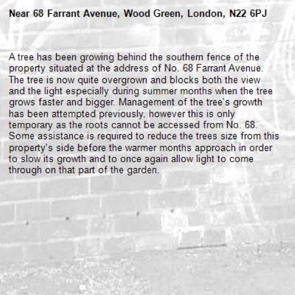 A tree has been growing behind the southern fence of the property situated at the address of No. 68 Farrant Avenue. The tree is now quite overgrown and blocks both the view and the light especially during summer months when the tree grows faster and bigger. Management of the tree's growth has been attempted previously, however this is only temporary as the roots cannot be accessed from No. 68. Some assistance is required to reduce the trees size from this property's side before the warmer months approach in order to slow its growth and to once again allow light to come through on that part of the garden.