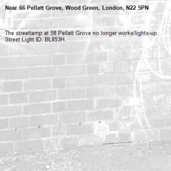 The streetlamp at 58 Pellatt Grove no longer works/lights-up. Street Light ID: BL853H.