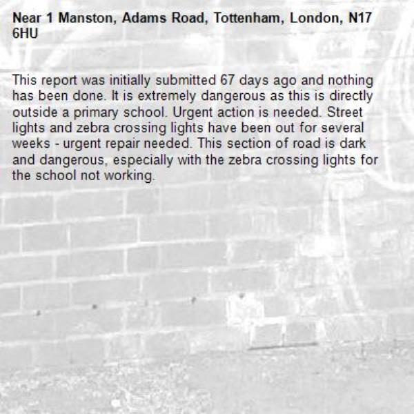 This report was initially submitted 67 days ago and nothing has been done. It is extremely dangerous as this is directly outside a primary school. Urgent action is needed. Street lights and zebra crossing lights have been out for several weeks - urgent repair needed. This section of road is dark and dangerous, especially with the zebra crossing lights for the school not working.