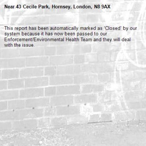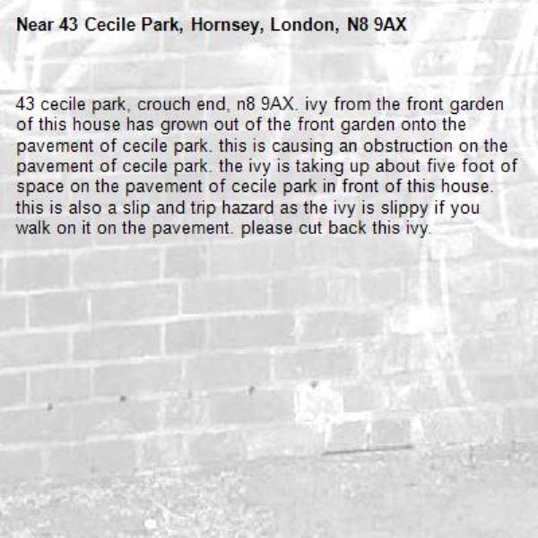 43 cecile park, crouch end, n8 9AX. ivy from the front garden of this house has grown out of the front garden onto the pavement of cecile park. this is causing an obstruction on the pavement of cecile park. the ivy is taking up about five foot of space on the pavement of cecile park in front of this house. this is also a slip and trip hazard as the ivy is slippy if you walk on it on the pavement. please cut back this ivy.
