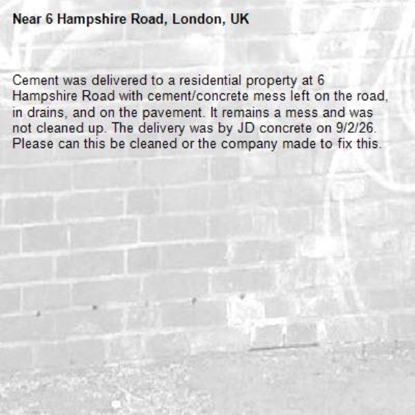 Cement was delivered to a residential property at 6 Hampshire Road with cement/concrete mess left on the road, in drains, and on the pavement. It remains a mess and was not cleaned up. The delivery was by JD concrete on 9/2/26. Please can this be cleaned or the company made to fix this.