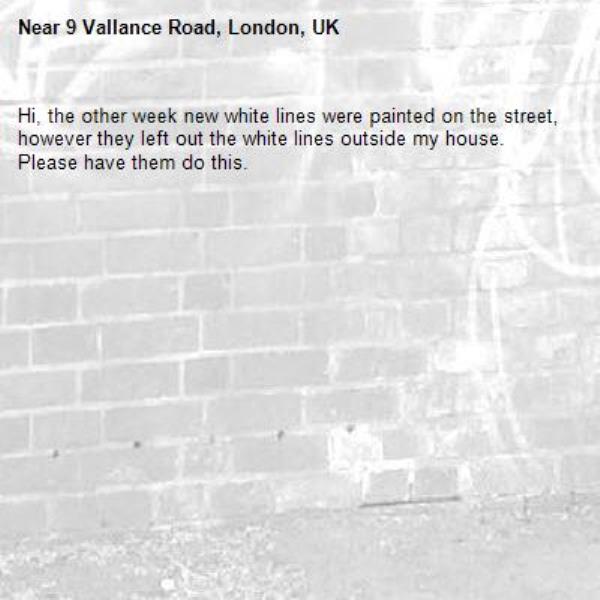 Hi, the other week new white lines were painted on the street, however they left out the white lines outside my house. Please have them do this.