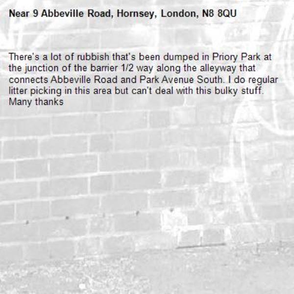 There's a lot of rubbish that's been dumped in Priory Park at the junction of the barrier 1/2 way along the alleyway that connects Abbeville Road and Park Avenue South. I do regular litter picking in this area but can't deal with this bulky stuff.