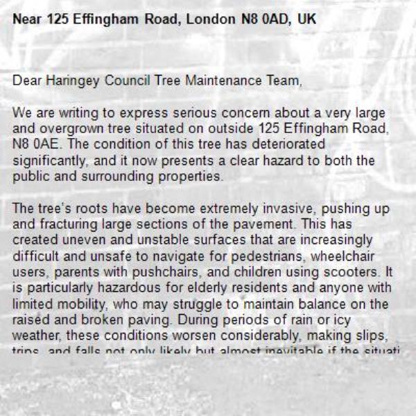 Dear Haringey Council Tree Maintenance Team,<br/><br/>We are writing to express serious concern about a very large and overgrown tree situated on outside 125 Effingham Road, N8 0AE. The condition of this tree has deteriorated significantly, and it now presents a clear hazard to both the public and surrounding properties.<br/><br/>The tree’s roots have become extremely invasive, pushing up and fracturing large sections of the pavement. This has created uneven and unstable surfaces that are increasingly difficult and unsafe to navigate for pedestrians, wheelchair users, parents with pushchairs, and children using scooters. It is particularly hazardous for elderly residents and anyone with limited mobility, who may struggle to maintain balance on the raised and broken paving. During periods of rain or icy weather, these conditions worsen considerably, making slips, trips, and falls not only likely but almost inevitable if the situation is left unaddressed.<br/><br/>Additionally, the upper branches of the tree have grown extensively into nearby telephone and utility cables. This raises serious safety concerns, especially during windy or stormy conditions, when movement or breakage could easily damage infrastructure or cause injury. There is also the potential for electrical sparks or power disruption should the branches come into contact with live cables, posing a serious fire and electrocution risk to nearby residents and properties.<br/><br/>Furthermore, the volume of falling leaves is also considerable. The pavement and residents’ front gardens are regularly covered in thick layers of wet leaves, which quickly become slippery and hazardous, especially during the icy weather. The ongoing accumulation poses a significant hazard to pedestrians and residents.<br/><br/>Given the scale of these issues, we respectfully request that the Council undertake an urgent inspection of this tree. It appears to have outgrown its location, and despite the environmental value of trees, this particular one now presents more risk than benefit in its current state. I would therefore ask that serious consideration be given to its removal to ensure the safety and wellbeing of local residents and pedestrians.<br/><br/>Many thanks for your continued support.<br/><br/>Kind regards,<br/>Concerned Residents.