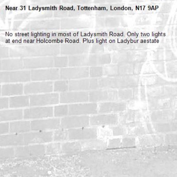 No street lighting in most of Ladysmith Road. Only two lights at end near Holcombe Road. Plus light on Ladybur aestate